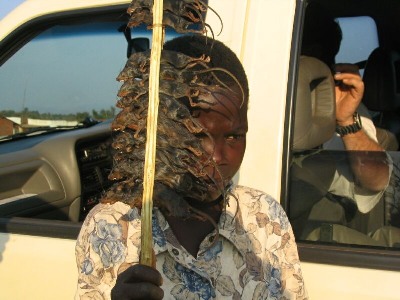 A görög szigetvilág felett szálltunk el, sosem jártam arra, ezért érdekes látványban volt részem. Pirinyó szigeteken laknak emberek, de hogy mit csinálhatnak ott, azt el se tudom képzelni. Kairó megdöbbentő volt, totál elrepültünk felette, elég közel a földhöz, mert leszállásra készülődtünk, így hát az egész várost nagyon közelről láthattam. Épp napnyugta után értünk oda, tehát még nem volt teljesen sötét, ám amikor lenéztem, odalent mégis minden sötétbe borult, sehol nem égtek lámpák az utcákon és a házakban sem. Szörnyű zsúfoltságban álltak az emeletes házak egymás hegyén-hátán, az utcák szélessége pár méter volt csupán. Iszonyatos nyomornegyedek ezek. A belváros kicsit más volt, ott már világítottak a lámpák mindenhol. A Nílus partján épült, de nekem nem tűnt olyan szépnek, mint a Duna-part... Éjjel tizenegykor indult tovább a gép, és hajnali háromra értünk Ugandába. Ahogy szálltunk lefelé, egyre vártam a fényeket, ahogy ez a repülőterek körül szokott lenni. Megdöbbentem, mert tök sötét volt. Azt hittem, még nem szállunk le, de egyszer csak landoltunk, és még mindig tök sötét volt... Odagurultunk egy bodega elé, ahová aztán gyalog kellett elballagni. Akadt jó néhány hangár is. A bodega ellenben elég kicsi volt... Nos, ez Uganda nemzetközi repülőtere! Nálunk a budaörsi nagyobb ennél! Viszont láttam, hogy „serényen” építkeznek, kibővítik a repülőteret. Az indulási oldal, mint később láttam, már normálisabb. Leszálltunk vagy tízen. Tovább nem ment a gép. Elég meleg, és zamatos volt az éjszakai levegő. Semmi cicó, nem volt határőrség, semmi sem, csak egy íróasztal, ahová odajárultunk vízumért, amit azonnal meg is kaptunk. Néhány taxis álldogált az éjszakában a bodega előtt. Leültem, hogy megvárjam Isaacot, a vendéglátómat, de hiába vártam. Isaac művészlélek, naná, hogy elfelejtett kijönni elém! Az egyik taxis telefonált neki, aki azután elvitt a szállodába. A
